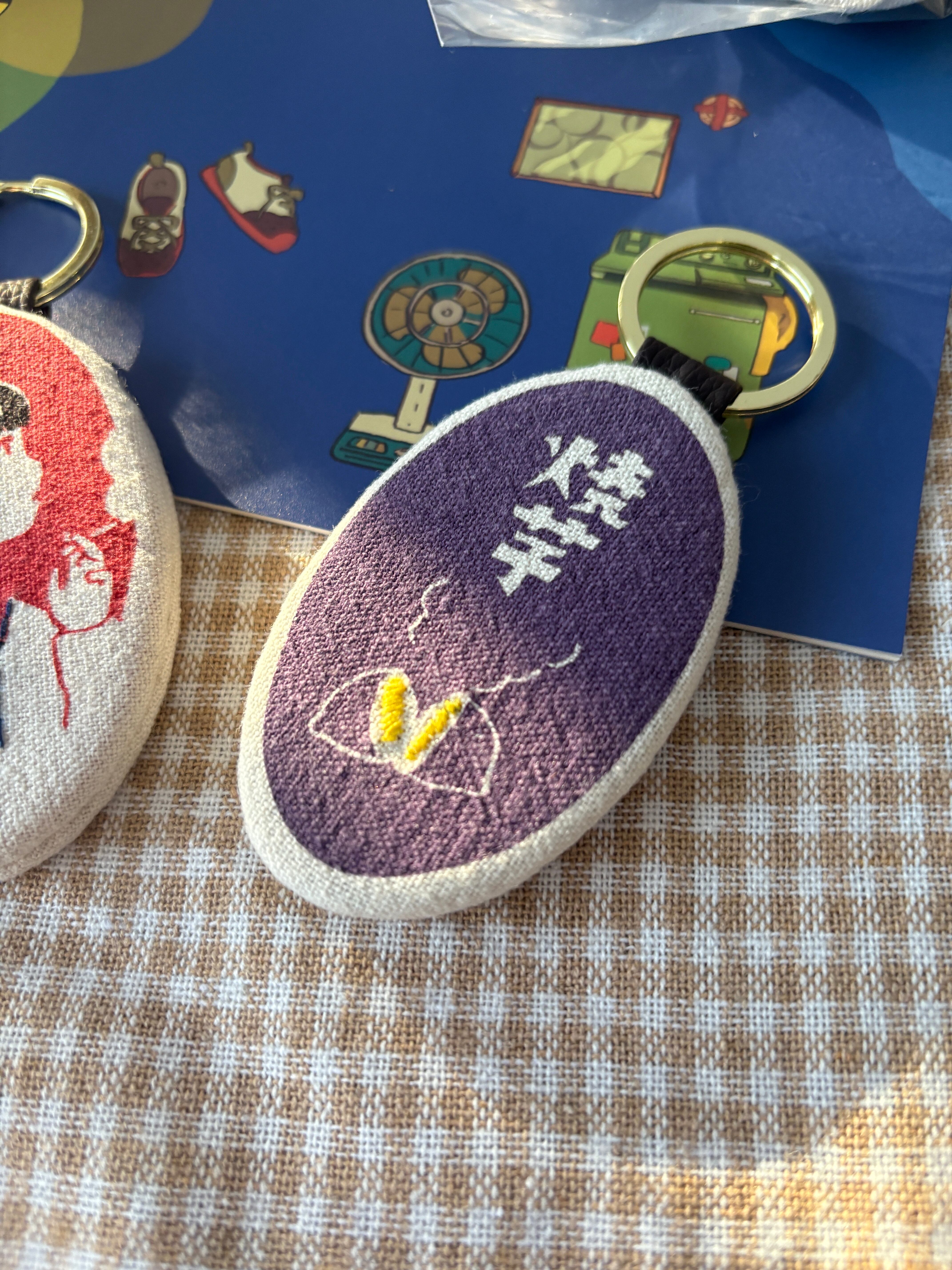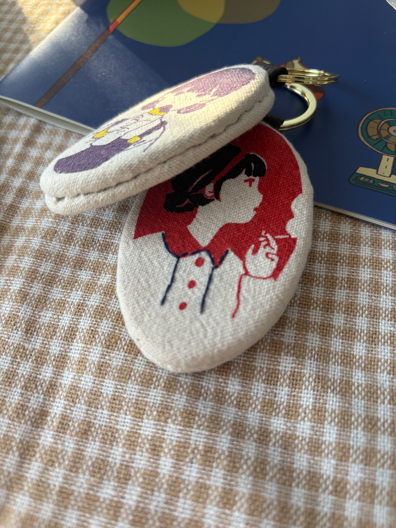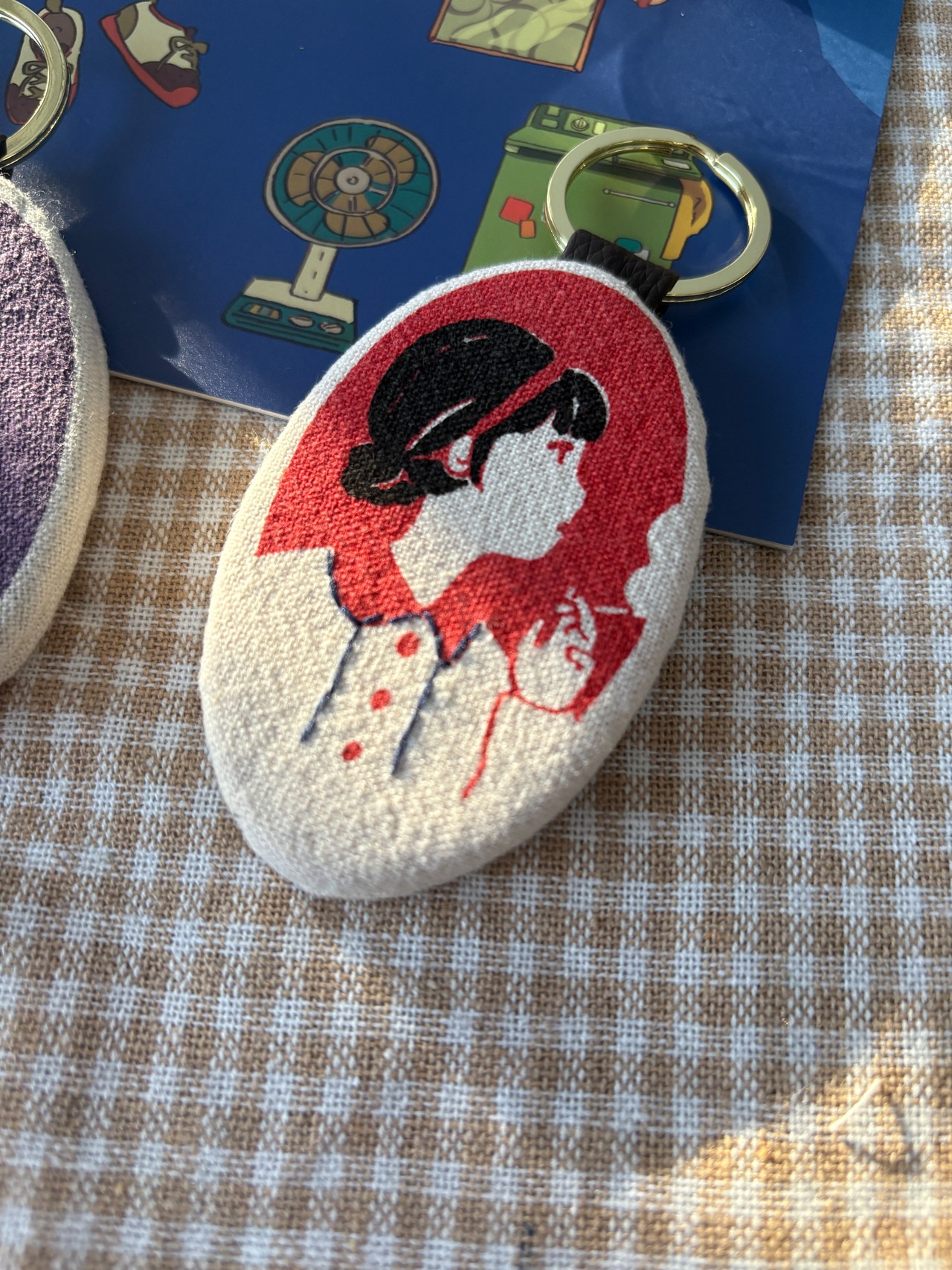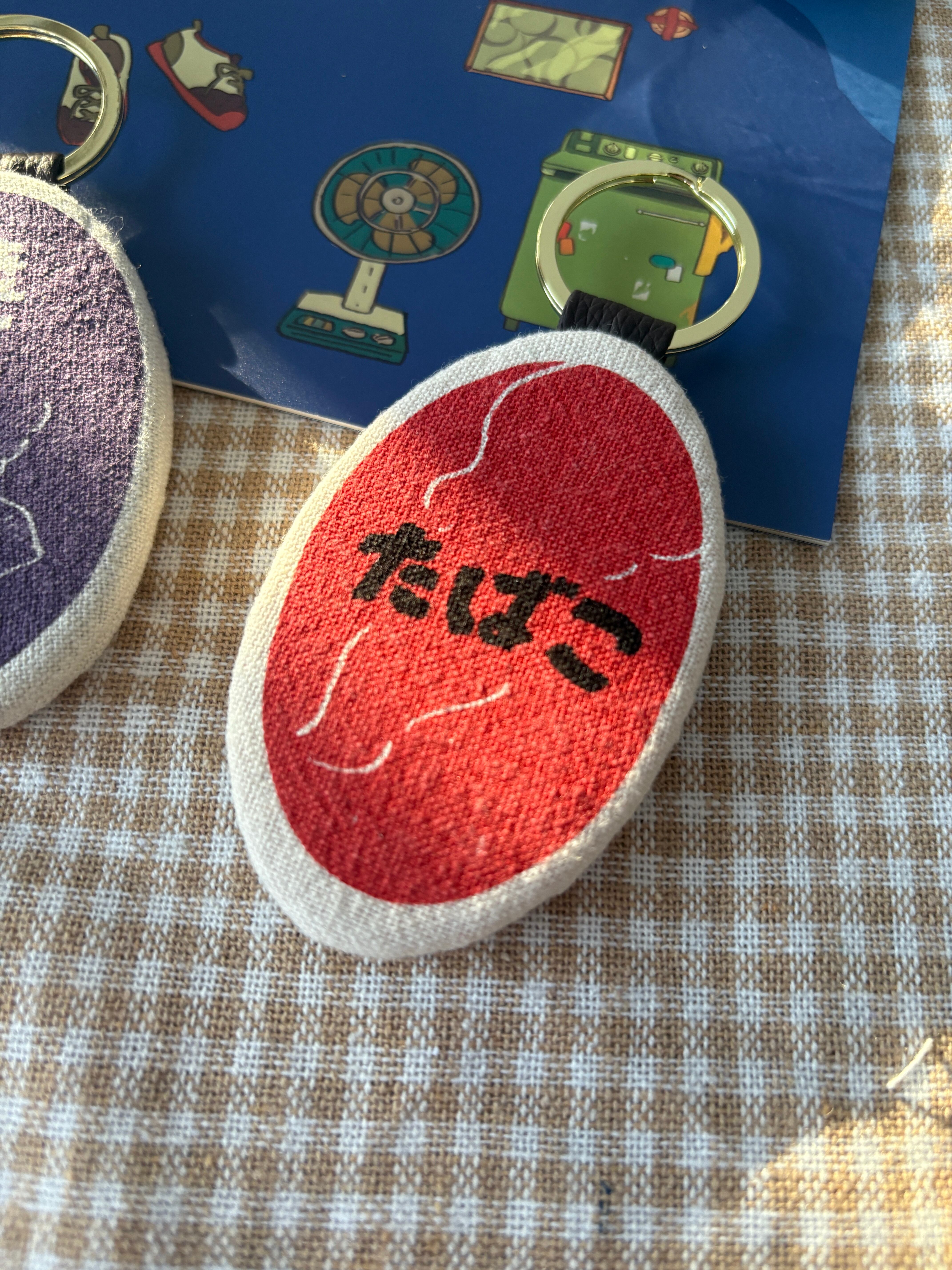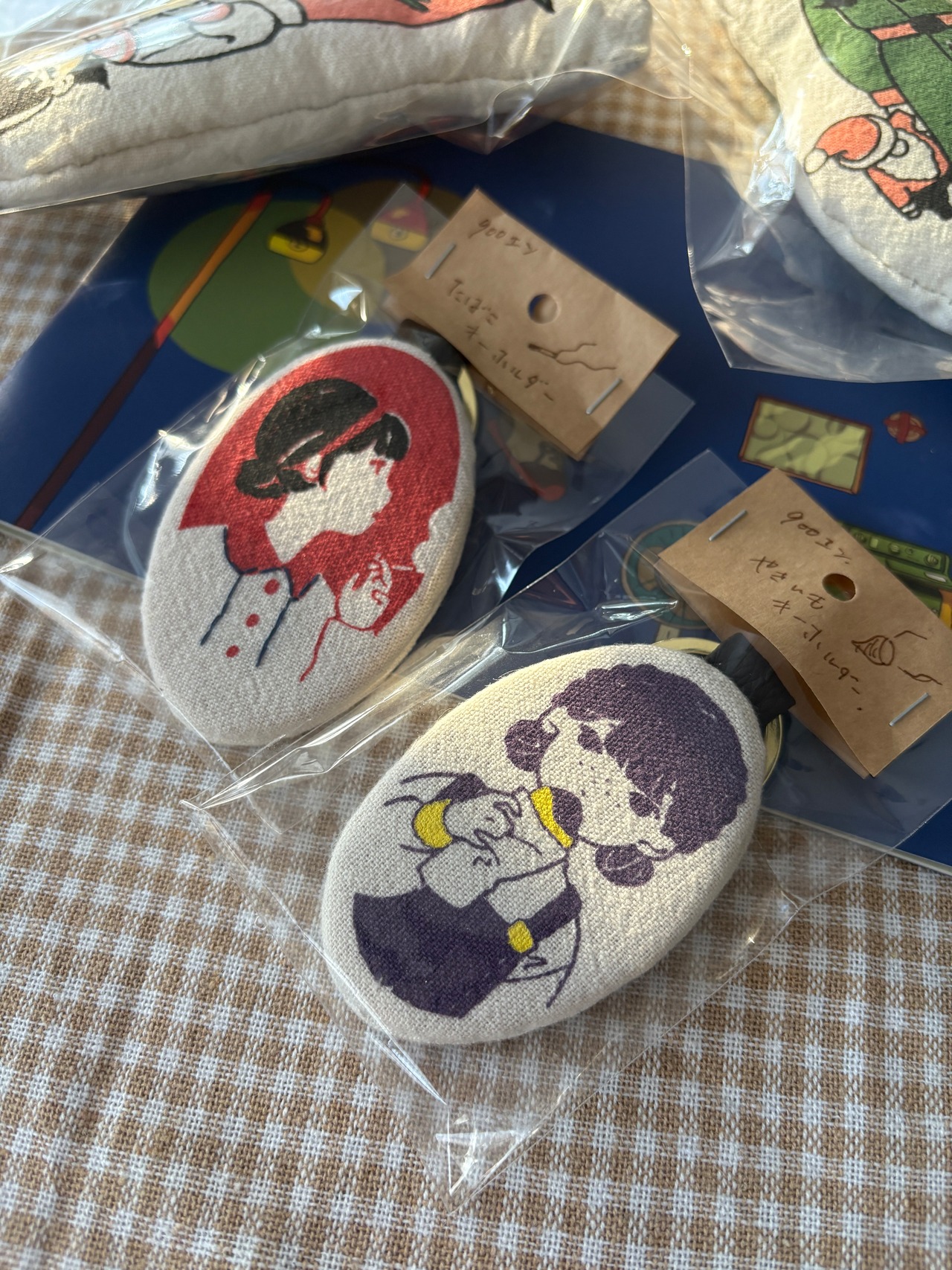 ひとつひとつ手刷りし、さらに手縫いで仕立てた、布ならではの温かみが感じられるキーホルダー。